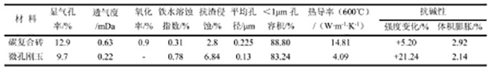 陶瓷杯熱導率較小,熱阻大,使得爐缸部位的冷卻系統難以發揮作用。并且陶瓷杯只能延緩侵蝕進度,陶瓷杯抗爐渣侵蝕性能較差,待陶瓷杯被侵蝕殆盡之后,依然會造成炭磚直接接觸鐵水。因此,研究人員將Al?O?和碳進行優化復合,試制了碳復合磚,其600℃熱導率約14.81 W·m-1·K-1,雖然略低于部分炭磚的熱導率,但是與剛玉質材料的熱導率4.09/5.42 W·m-1·K-1相比有很大提高,同時保持了陶瓷材料的優良抗侵蝕性,具體性能見表4。可在鐵水與磚接觸面形成保護層,即使保護層脫落,也具有足夠的抗鐵水侵蝕性,保護爐缸部位的安全。碳復合磚兼顧了炭磚和陶瓷杯的優勢,實現“自保護”和“他保護”結合,是新一代爐缸爐底耐火材料的發展方向之一。
