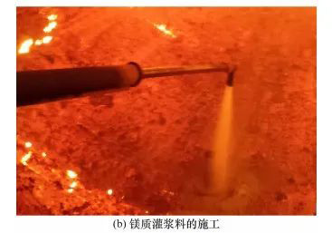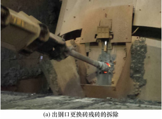 圖1:出鋼口更換磚殘磚的拆除和鎂質灌漿料的施工