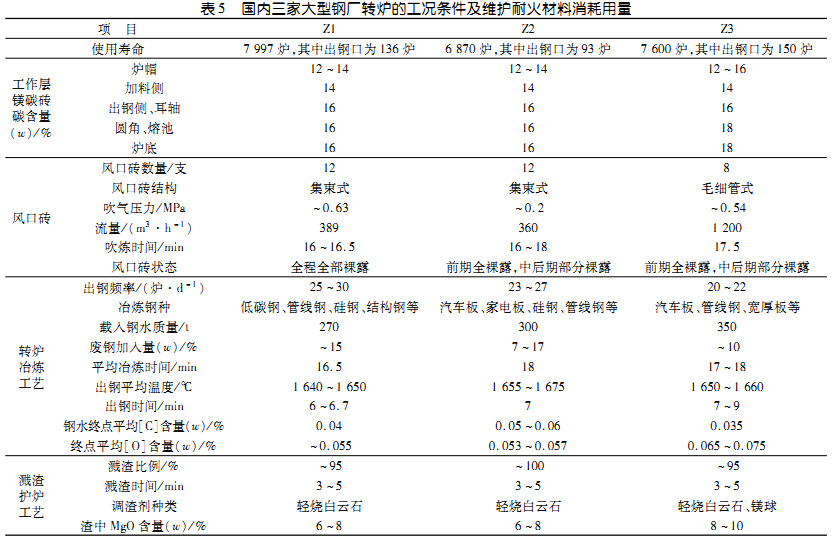 工況條件的相關性選取國內三家大型鋼廠的3座頂底復吹轉爐,編號分別為Z1、Z2和Z3,詳細分析其工作層鎂碳磚配置及冶煉工況條件差異,并列出其維護用耐火材料的消耗量,如表5所示。從表中可看出:這三座轉爐工作層鎂碳磚的配置基本相同,但工況條件有差異,Z1的工況條件苛刻,Z2的次之,Z3的好;三座轉爐維護用耐火材料的噸鋼消耗差異較大,分別為0.75kg(Z1)、0.62kg(Z2)和0.51kg(Z3)。結合這三座轉爐的工況條件,分析其總體維護耐火材料選擇及噸鋼消耗差異較大的原因如下:
