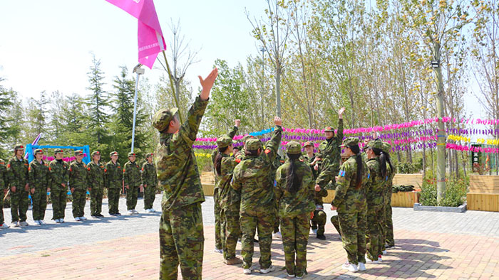 開訓前,在破冰啟航環節——【智勇通關】項目中,每組選一個大魔王來防守別隊,該隊隊員依次挑戰大魔王,石頭剪刀布定輸贏,贏了直接通過,輸了轉一圈,回來接著挑戰,再輸即增加圈數,直到全部隊員通過。大家把團隊當成了自己的“城堡”,在“對抗魔王”中,每個隊員都拼盡全力,期待被幸運女神光顧,期待團隊能盡早完成任務,大家的歡笑聲、喝彩聲灑滿了訓練場。