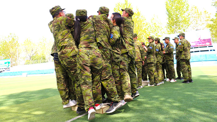 在【沙場點兵】項目,要求每個隊選出一個總指揮做將軍,一個協調者做軍師,剩余伙伴作為士兵。設定將軍起著總指揮的作用,但無法看見戰場的具體情況,其命令需由軍師來傳達。而軍師則只能用肢體語言告訴將軍該如何部署,士兵們則需要蒙著眼睛聽將軍命令,從而實現在沙場前進、攻擊。當規則定好,每個人所要做的就是各司其職。有人規劃部署,有人上傳下達,有人依命令行事,雖然有理解錯誤、聽錯命令的情況發生,大家還是玩得不亦樂乎。在這個項目中,大家感悟到正確溝通的重要性。