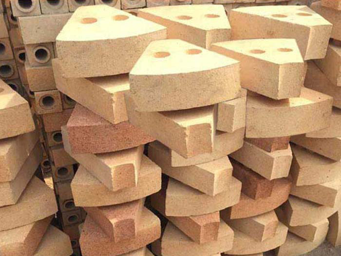 扇形耐火磚(粘土質)的Al2O3含量一般多在40%以上,Fe2O3含量小于2.0~2.5%。配料中熟料為65~85%,結合粘土為35~15%。將粉碎的結合粘土和磨細的熟料混磨,再與顆粒熟料一起配制成半干泥料,高壓成型,在約1400℃下燒成,性能較好。粘土磚在高溫下呈弱酸性,抗堿性熔渣侵蝕的能力稍差,但隨Al2O3含量提高而增強。