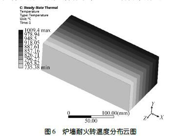 耐火磚模擬分析的溫度分布云圖如圖6 所示,構成爐墻的碳化硅磚由內部到外部存在較大的溫度梯度。工作面與非工作面溫度的差異使