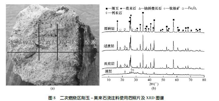 圖8是二次燃燒區用后剛玉- 莫來石澆注料殘襯照片以及各層的XRD 圖譜。分析表明,反應層、滲透層形成了少量的長石類礦物相。在實際工況下,長石類礦物的熔點較低,高溫是熔融狀態,熔渣與耐火材料反應形成的低熔點物向熔渣中溶解,并逐漸被高速含塵煙氣沖刷掉,終導致內襯耐火材料被磨穿。