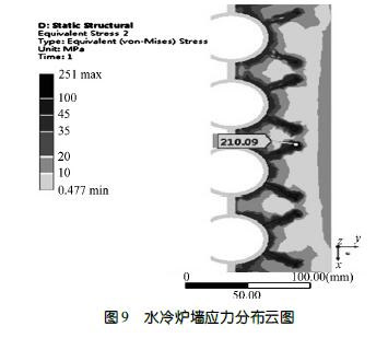 焚燒爐余熱發電鍋爐水冷壁配置厚度70 ~ 110mm 耐火可塑料或者澆注料,使用后會出現銷釘頭端面以外的耐火材料分層并脫落,脫落區域附近有細小裂紋。根據圖9 所示水冷爐壁應力模擬分析可知,高溫條下,金屬錨固件的熱膨脹大于耐火材料的,在耐火材料與金屬銷釘界面應力較大區域,大量銷釘共同作用使耐火材料產生分層,導致耐火材料脫落。