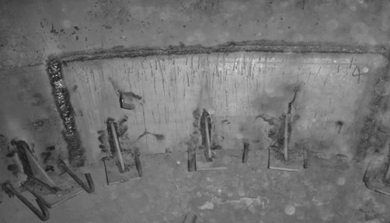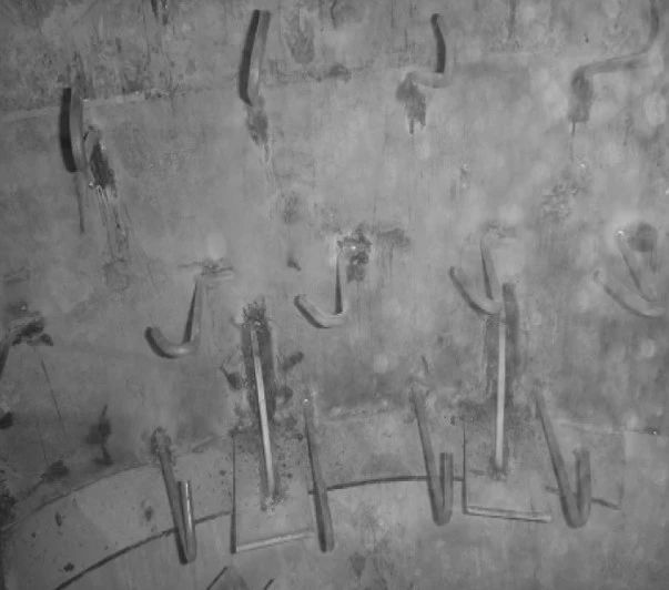 (4)原錨固件為Y銷釘,每隔150mm交錯布置,銷釘端部沒有鋼筋網(wǎng)格,使耐火材料無法形成整體,個別銷釘失效后會使局部耐火材料松動,相鄰耐火材料之間沒有可靠聯(lián)系,zui終脫落。