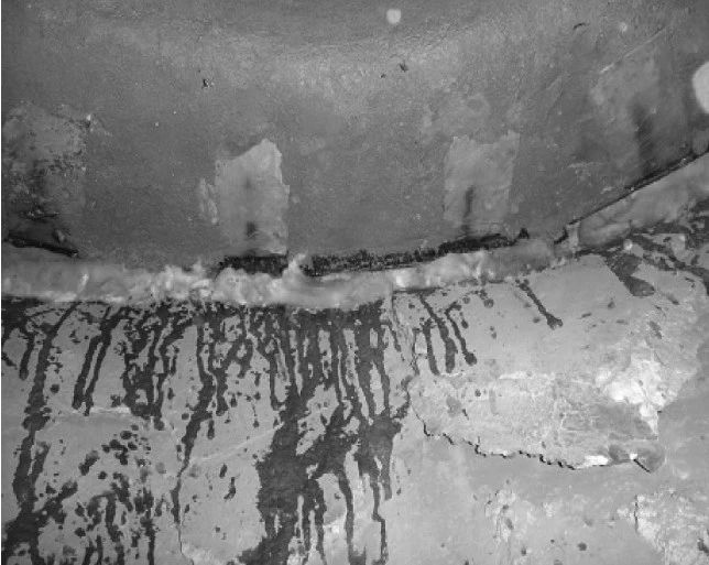 3、耐磨可塑料施工。可塑料敷設(shè)在施工構(gòu)件上后,用木錘或橡皮錘搗打密實。塊與塊之間的接縫也應(yīng)搗打密實,使接縫嚴(yán)密,將表面壓光、壓平。所施工部位與原來墻體接縫處應(yīng)確保平滑過渡,不得凹進(jìn)或凸出。用磷酸鋁溶液浸泡硅酸鋁纖維板封堵膨脹縫,避免鍋爐運行過程中出現(xiàn)竄風(fēng)現(xiàn)象,導(dǎo)致非金屬補(bǔ)償器燒損。耐磨可塑料施工完畢后的膨脹縫封堵如圖4所示。
