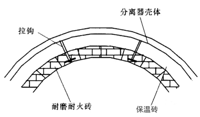 如圖7所示,為分層拉鉤磚結構形式,在分離器的圓筒部分及錐段部分均采取楔形耐磨磚與拉鉤磚配合的這種結構,可有效防止耐磨耐火磚的脫落,使任何一塊獨立的耐磨耐火磚幾乎沒有可能脫落。