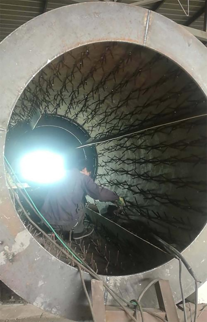 另外,部分回轉(zhuǎn)窯采用輕質(zhì)澆注料或者纖維板等作為隔材料,工作層采用重質(zhì)澆注料(金屬抓釘錨固)雙層澆注結(jié)構(gòu),可以合理控制回轉(zhuǎn)窯外壁溫度。該結(jié)構(gòu)采用金屬件把耐火材料和筒體連為一體,不存在耐火磚脫落問題,但是金屬件焊接質(zhì)量和澆注料中水份烘干排出是關(guān)鍵。