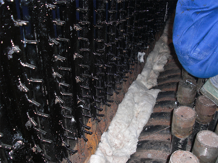 因金屬材料與耐磨材料受熱后線脹系數(shù)的差異,在耐磨耐火材料施工前,必需在金屬材料( 包括銷釘, 托板及管子) 表面涂瀝青, 涂刷瀝清是在澆注料與受熱面之間留有一定的間隙, 運(yùn)行時(shí)受熱面熱膨脹差不會(huì)對耐磨材料造成破壞。